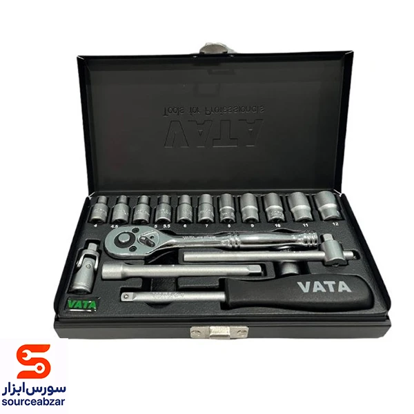 1500 گرمجعبه بکس VATA ساخت کشور تایوان جنس الیاژ کروم وانادیوم درایو1/4 دارای 12 عدد بکس از سایز 4 میلیمتر تا 13 میلیمتر دسته جغجغه لغلغه دسته کشویی رابط بکس بلند رابط دسته پیچ گوشتی دار جعبه بکس حرفه ای وصنعتی می باشد